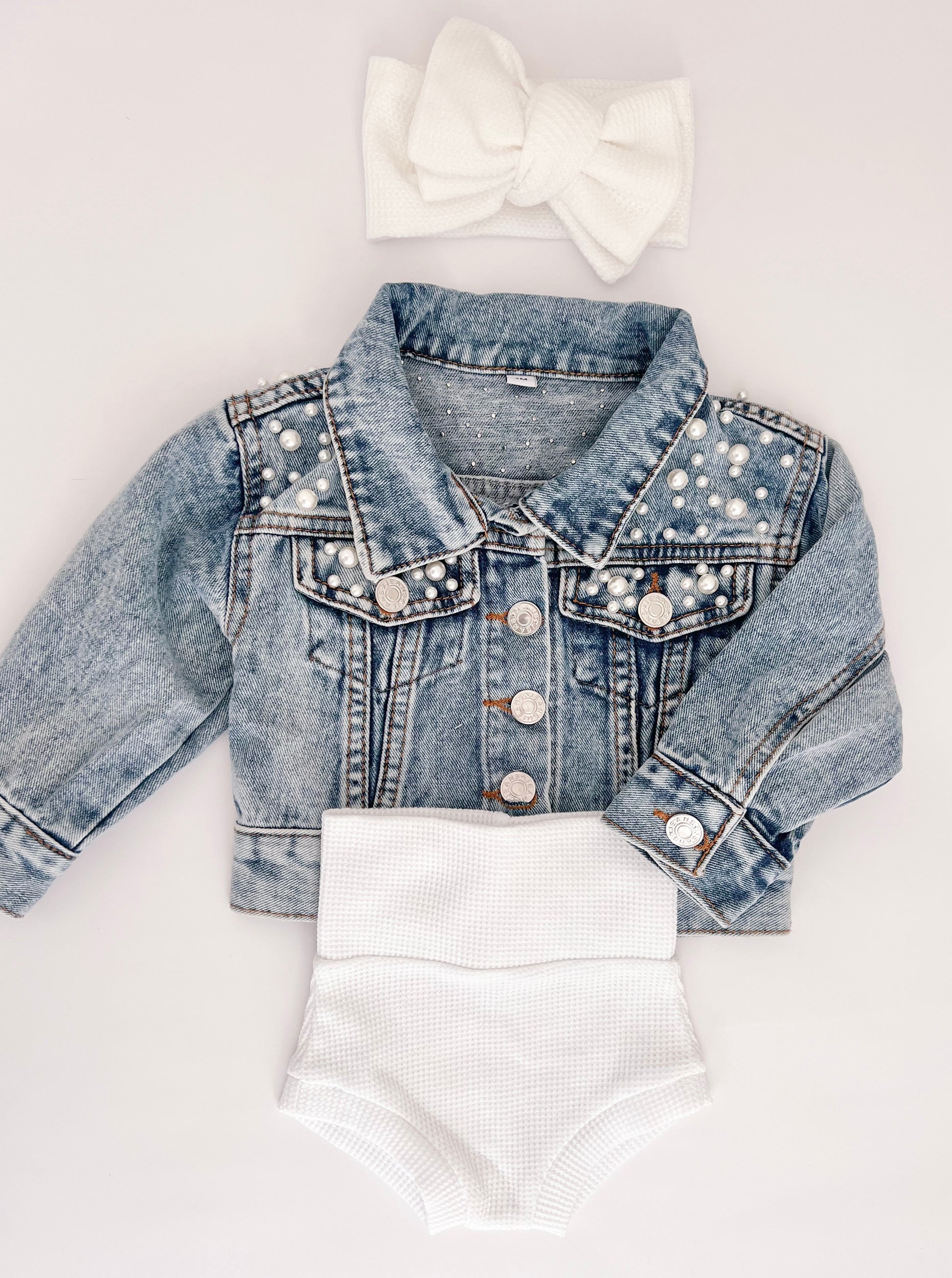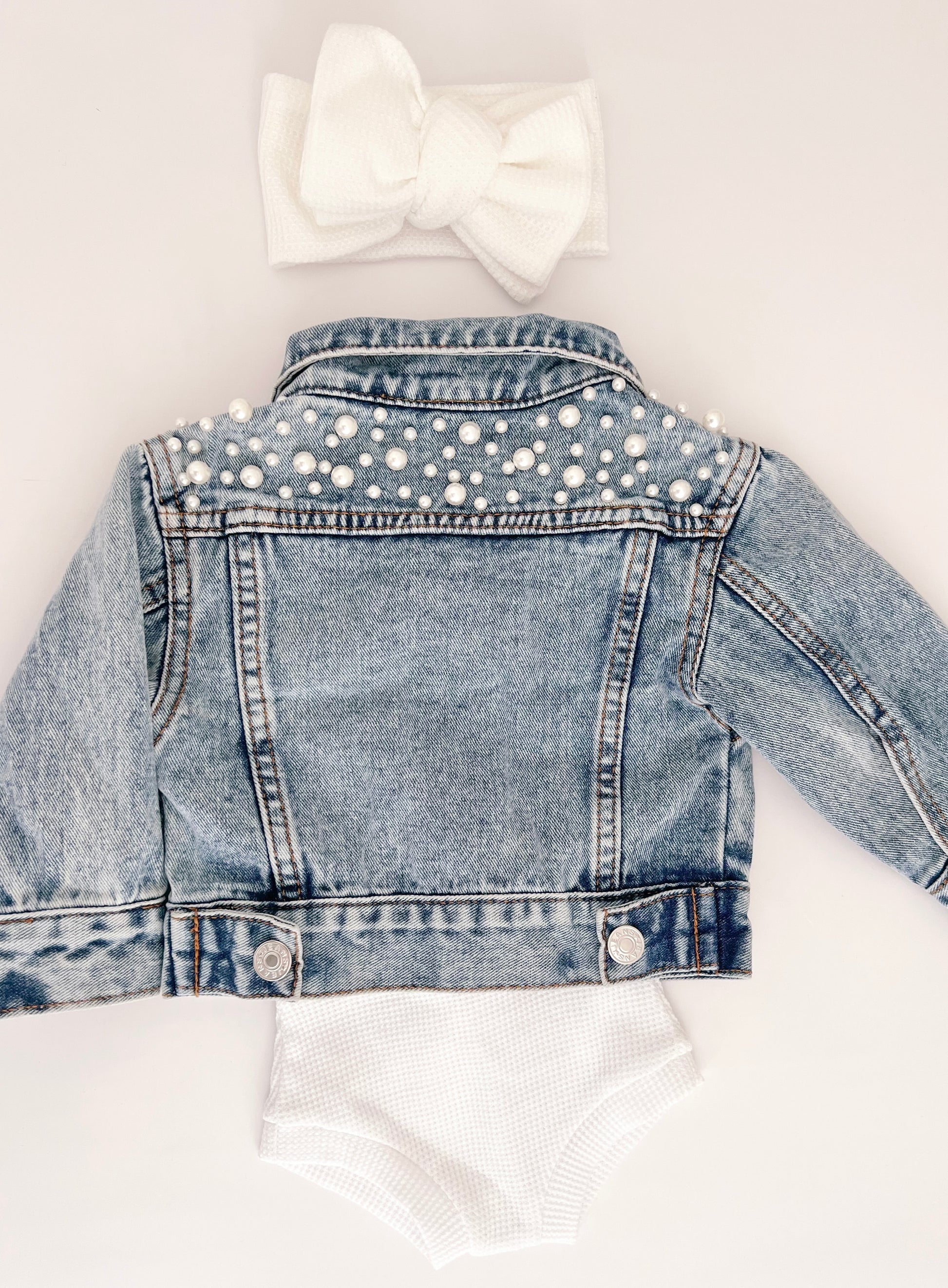 Theses kids Pearl Denim Jackets can be purchased as is or can be personalised with an iron on transfer in variety of colours and designs.