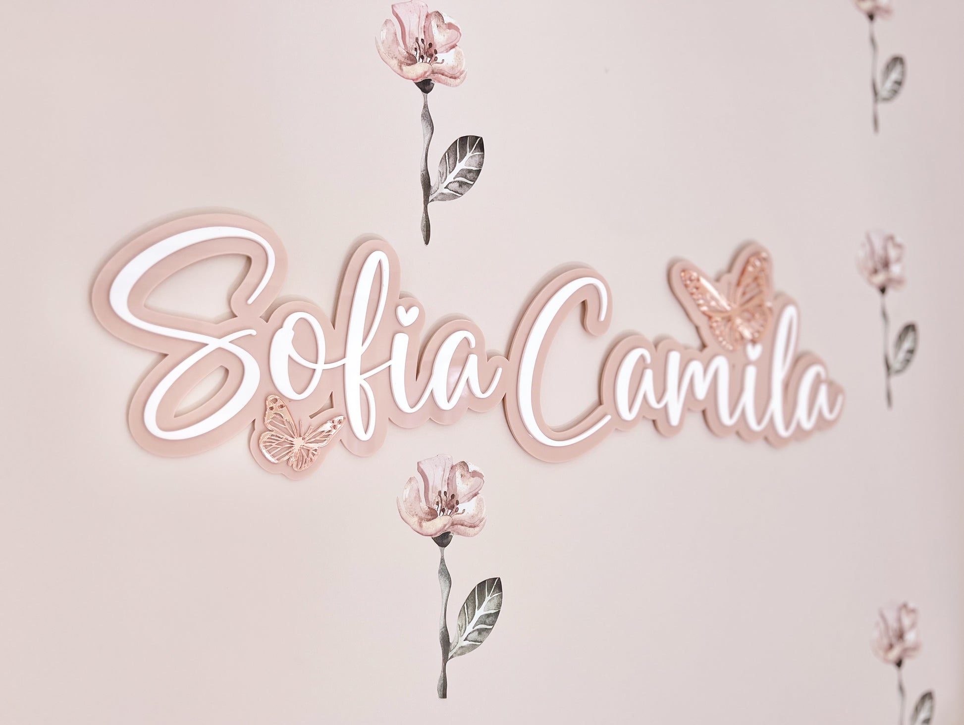 Personalised double layer name sign plaque from our Butterfly Collection, perfect for nursery wall art and kids room decor. Customise your name plaque with font and colours of your choice, to create a truly unique piece.